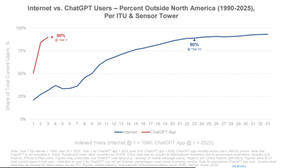 Examining global penetration rates, ChatGPT achieved 90% of its user base outside North America within three years. The internet took 23 years to reach the same milestone.