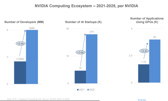 - NVIDIA Developer Growth: ~1 million registered developers (2018) → 6 million (2025). These are elite developers mastering GPU and foundational tech.