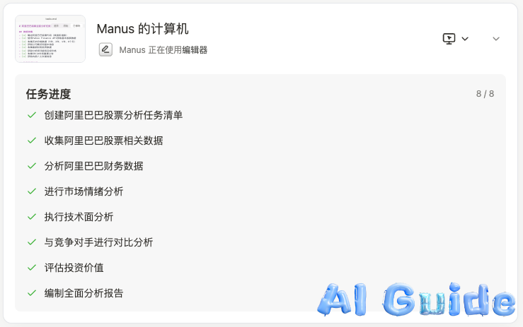 The right interface is like a PPT, constantly flipping pages, allowing you to see in real-time what Manus is doing, every thought, every action, the sense of control is incredibly strong. Even if it takes a long time, watching it execute step by step is really satisfying. The task steps in the lower right corner can also be expanded, clearly showing which major step is currently being executed.